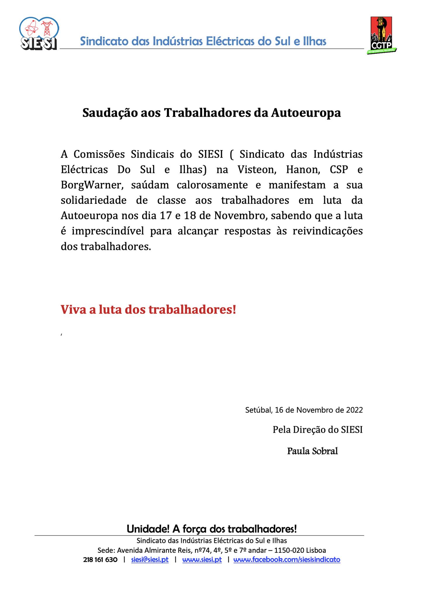 - Saudação das comissões sindicais do SIESI na Visteon, na Hanon, na CSP e na BorgWarner