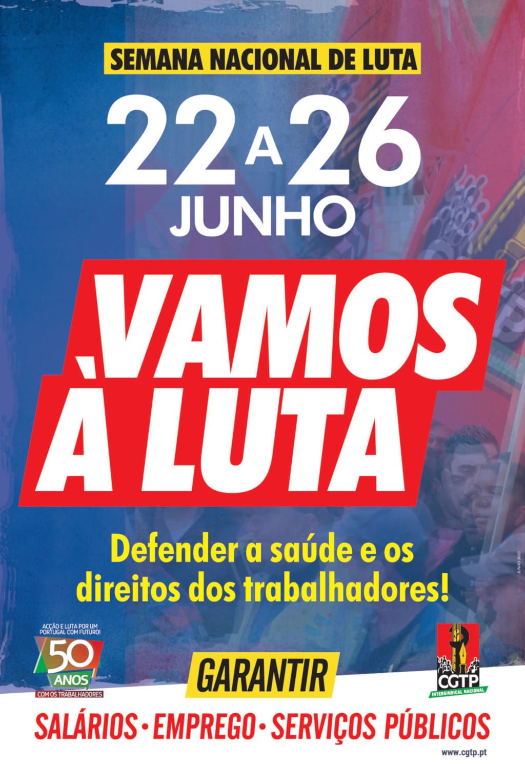 A CGTP-IN realiza de 22 a 26 de Junho, uma semana nacional de luta, com acções nos locais de trabalho e na rua, em todos os sectores e regiões, sob o lema «Vamos à luta - Defender a saúde e os direitos dos trabalhadores! - Salários, Emprego e Serviços Públicos».