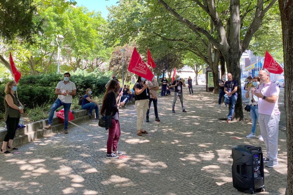 Os trabalhadores reuniram-se no jardim frente à entrada principal da sede da INCM, em Lisboa. A comissão sindical preparou o local de forma a respeitar as recomendações sanitárias da DGS, designadamente quanto ao distanciamento físico e uso de material desinfectante e máscaras.