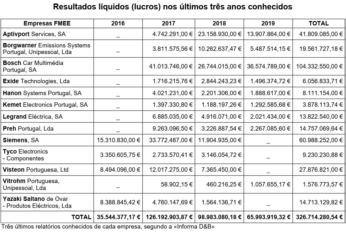 São publicados os resultados de um levantamento feito pela federação, mostrando como os resultados líquidos (lucros) de 13 empresas do sector FMEE, nos últimos três anos conhecidos, ultrapassaram 326 milhões de euros.
