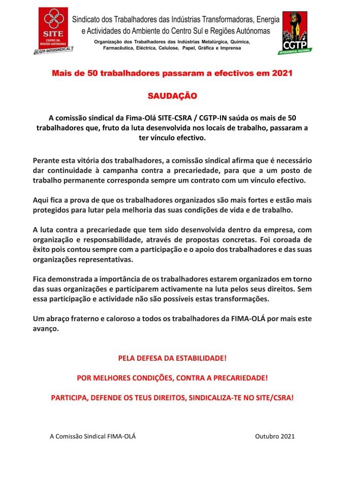 - Saudação da Comissão Sindical do SITE CSRA aos trabalhadores da Fima-Olá