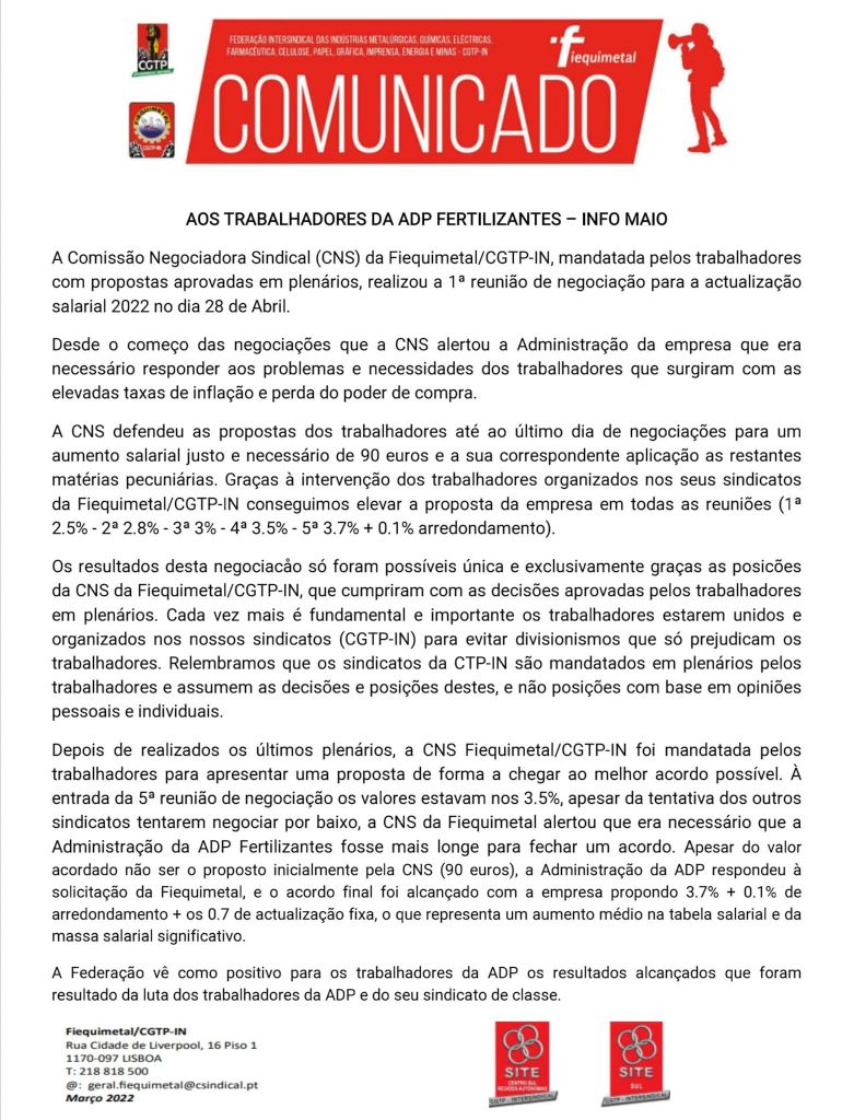 Com a firmeza dos trabalhadores e da sua comissão negociadora sindical, ao fim de cinco reuniões foi alcançado na ADP Fertilizantes um acordo de revisão salarial anual que representa um significativo aumento médio.
