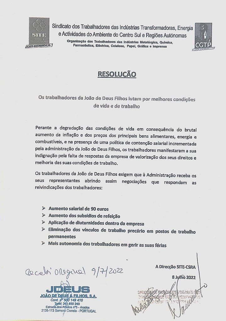 Como referem na resolução aprovada e entregue ao cuidado da administração, os trabalhadores exigem que esta receba os seus representantes e inicie negociações, para responder a cinco pontos reivindicativos: