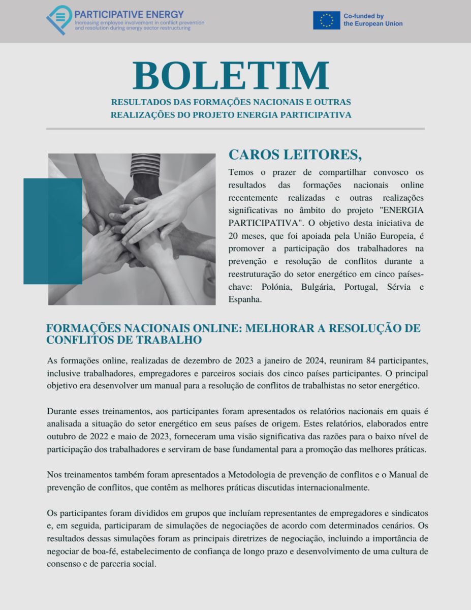 Esta iniciativa de 20 meses, apoiada pela União Europeia, visa promover a participação dos trabalhadores na prevenção e resolução de conflitos, durante a reestruturação do sector energético em cinco países-chave: Polónia, Bulgária, Portugal, Sérvia e Espanha.