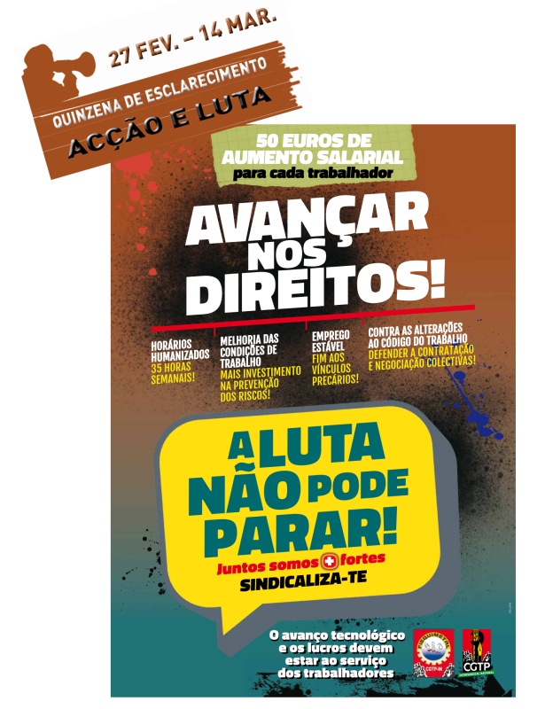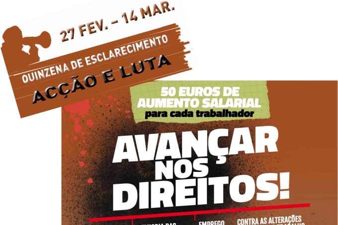 A «quinzena de esclarecimento acção e luta», que decorre entre 27 de Fevereiro e 14 de Março, sob a palavra de ordem «Avançar nos direitos! A luta não pode parar!», tem como eixo central as exigências de: